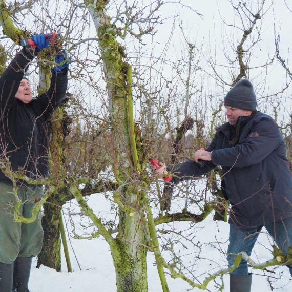 - Snoei (hoofdactiviteit): Het snoeien van appel- en perenbomen vindt plaats wanneer er geen blad aan de boom zit. Het doel is het verwijderen van oud hout, zieke takken en de snelgroeiende verticale takken om de boom open te houden en de vruchtkwaliteit te verbeteren.